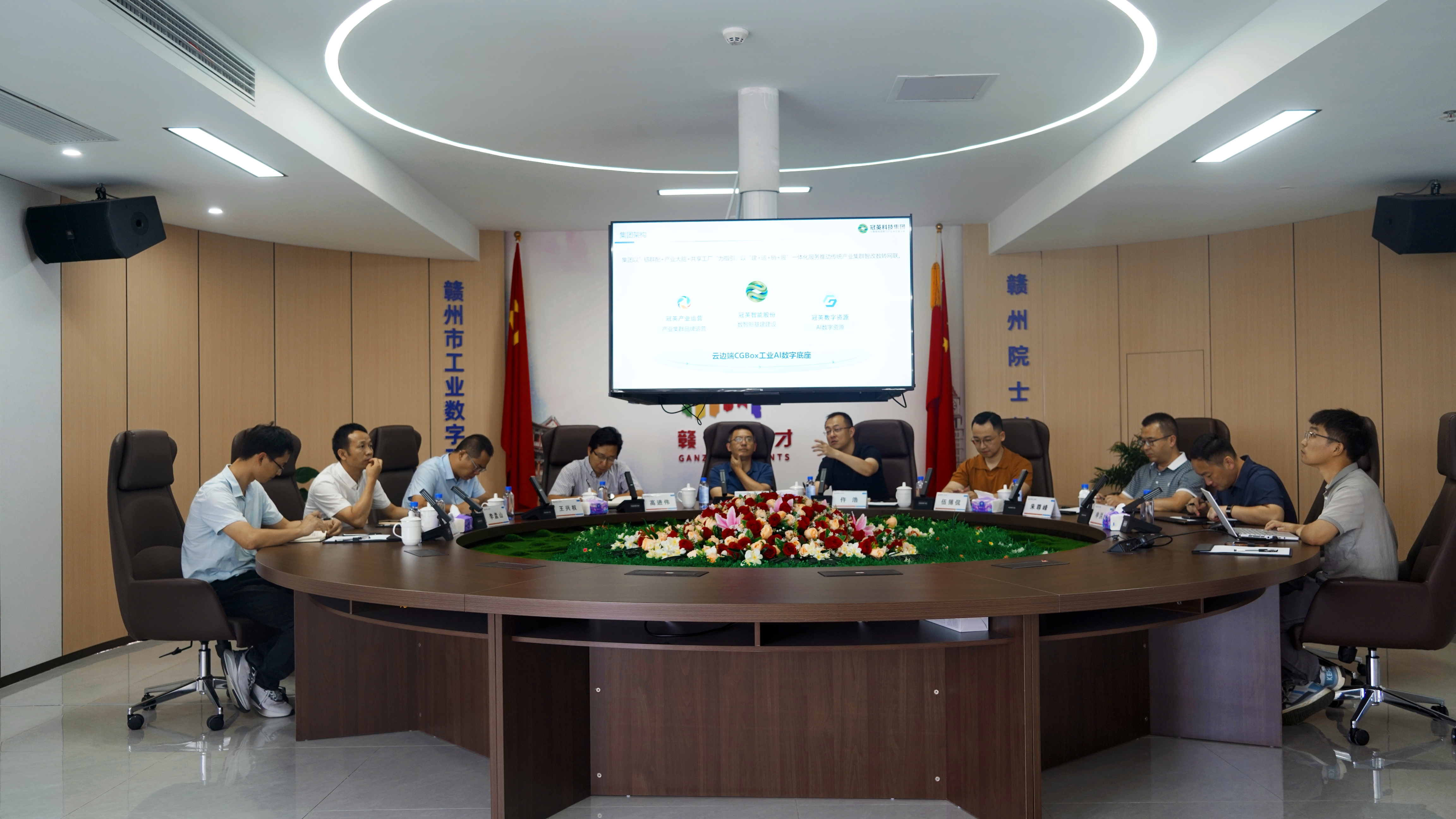 伍簙侃对谢晓春一行的到来表示热烈欢迎,并从发展历程、核心业务、科技成果、未来发展等方面介绍了赣州工研院。他表示,作为赣州数字经济发展的助力者,赣州工研院致力于探索人工智能与数据要素在产业数字化与数字产业化协同发展上的无限可能,希望进一步深化校企合作,拓展合作广度与深度,实现优势互补。